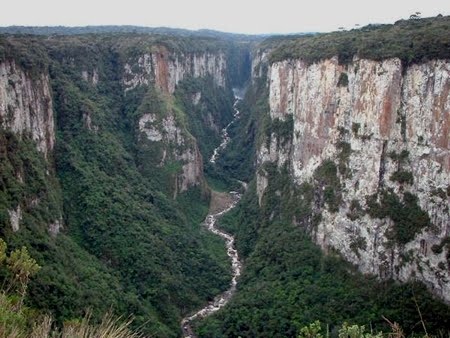 Parque Aparados da Serra: "A unidade foi criada em pelo decreto n.º 47.446 de 17.12. 1959 e alterada pelo decreto n.º 70.296 de 17.03.1972 e possui uma área de 10250 ha e perímetro de 63 km, sendo fronteira ao Parque Nacional da Serra Geral. Diante da total identidade entre as duas unidades, a administração é única para ambos os parques e é feita pelo Instituto Chico Mendes de Conservação da Biodiversidade (ICMBio). Formado por mata Atlântica e a floresta de Araucária,campos e penhascos que são morada de papagaios-de-peito-roxo, a jaguatirica, o guaxinim e até chamado o leão-baio. Dizem que no verão, e em épocas chuvosas, quando fica alagado, a onça-pintada aparece naquela região".